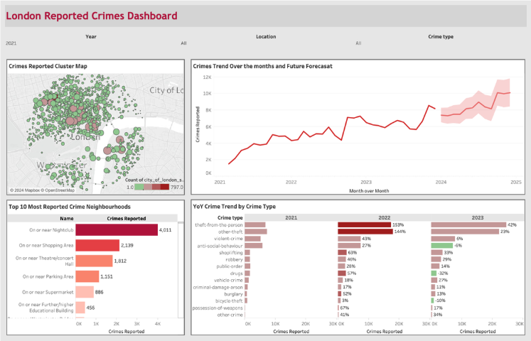 The London Reported Crimes Dashboard analyzes crime trends using data from the UK Police API. It features cluster maps of high-crime areas, tracks monthly and yearly trends, and predicts future rates. K-Means clustering groups crime types, while a Random Forest Classifier assesses classification accuracy to deliver actionable insights on London’s crime patterns.